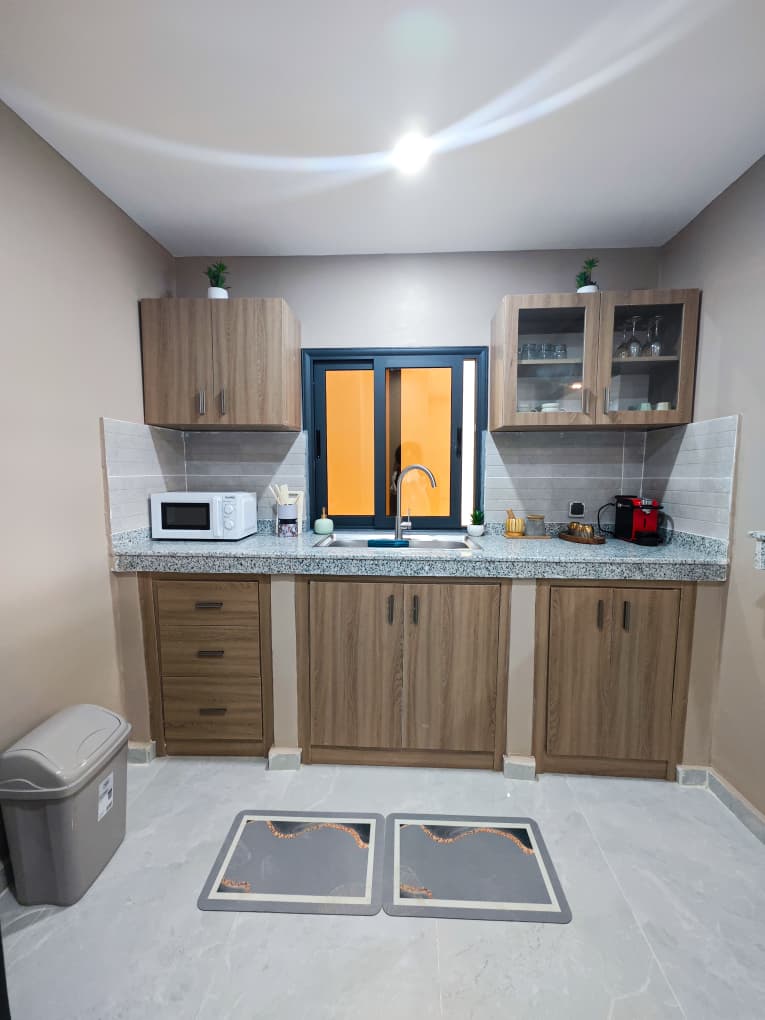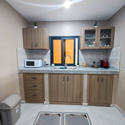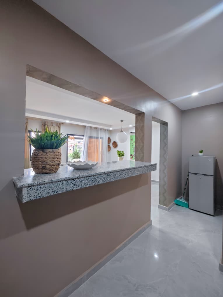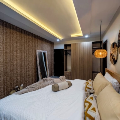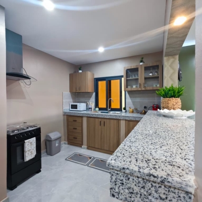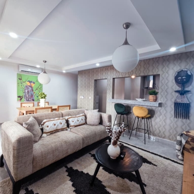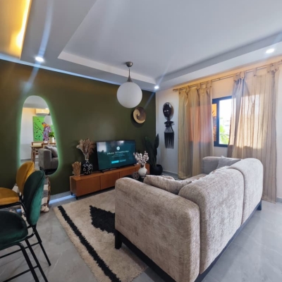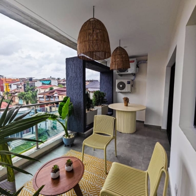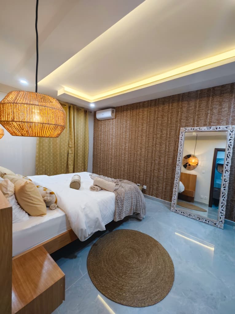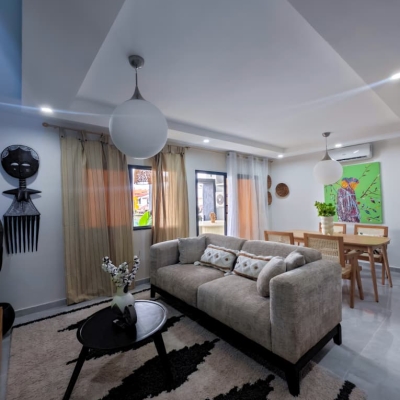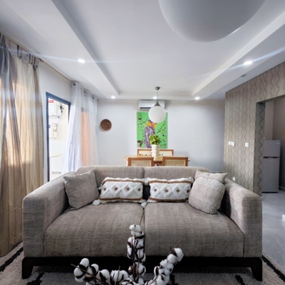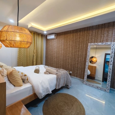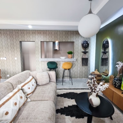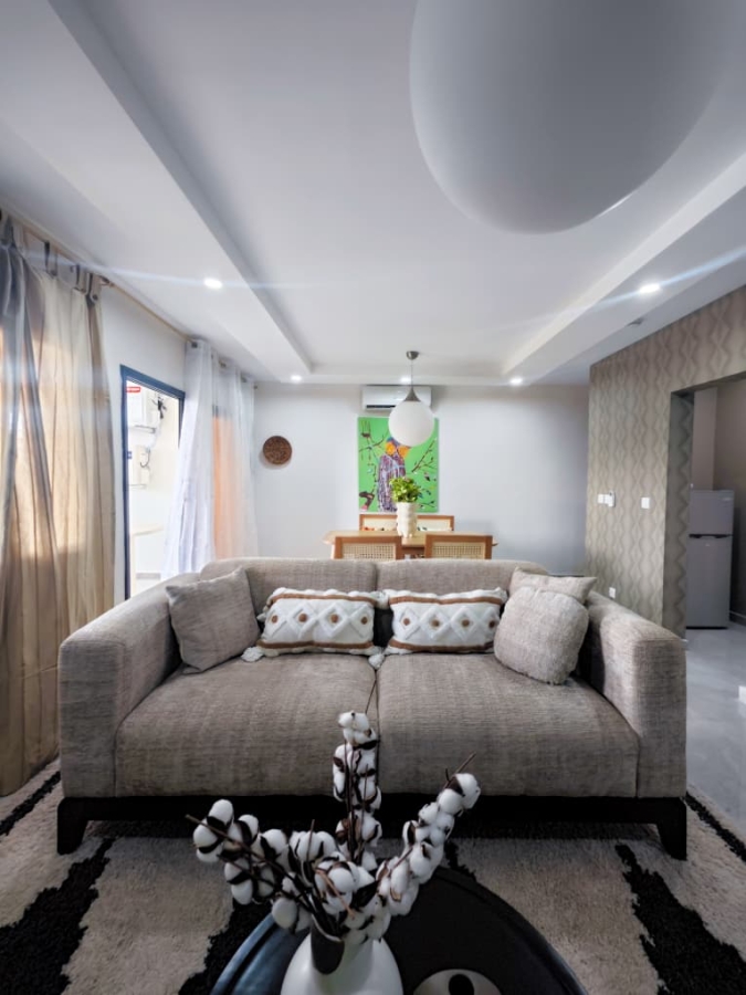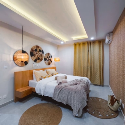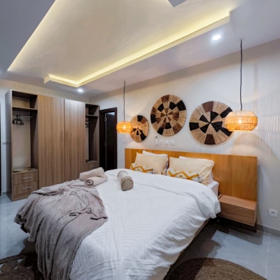 Situé à Abidjan, dans la commune de Cocody, l’Appartement Le Muguet est un 2 pièces où confort et charme s’harmonisent à la perfection et tout cela dans un beau bâtiment sécurisé qui vous séduira par sa décoration épurée et par la qualité des services proposées, cet appartement meublé est au 3 ème étage dans un bâtiment neuf avec ascenseur et dispose de toutes les commodités et bénéficie d’un séjour salle à manger, une cuisine équipée, un balcon aménagé avec vue sur le secteur, une connexion internet, un abonnement canal, un parking souterrain, afin de vous permettre de passer un séjour de qualité en toute sécurité.