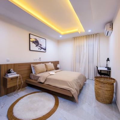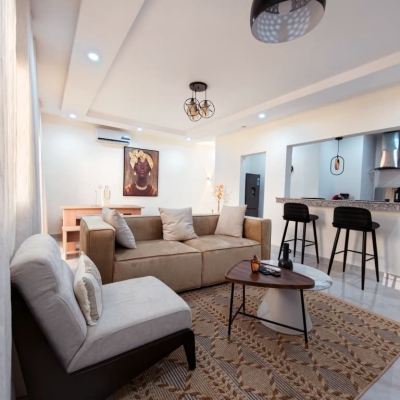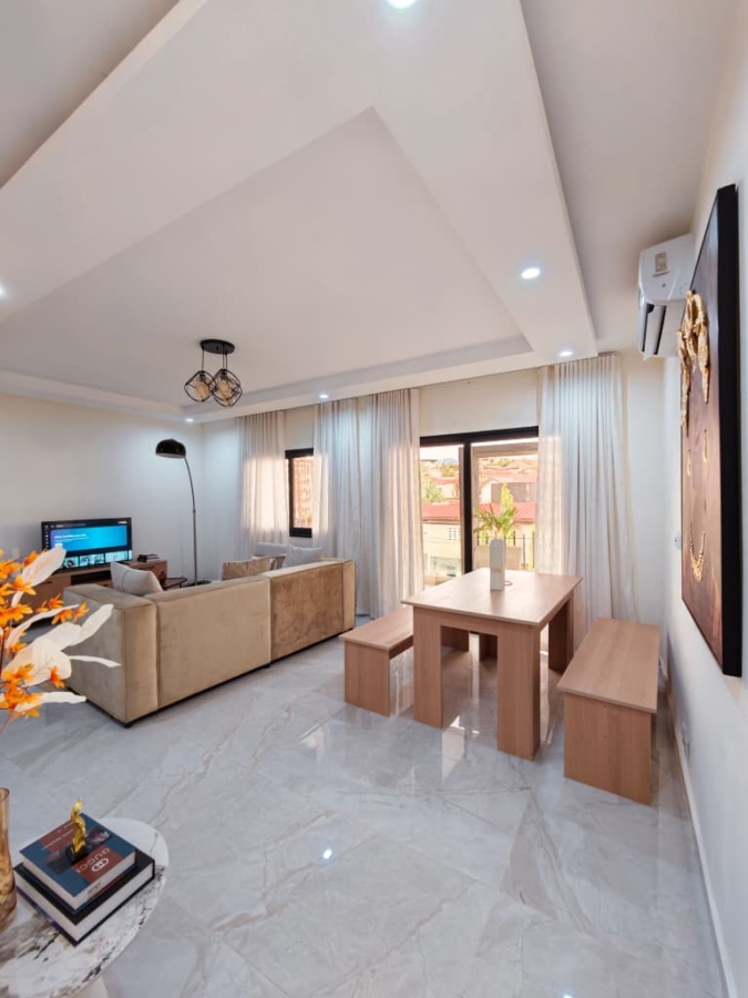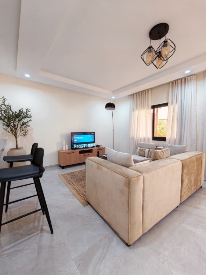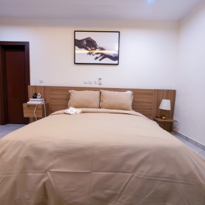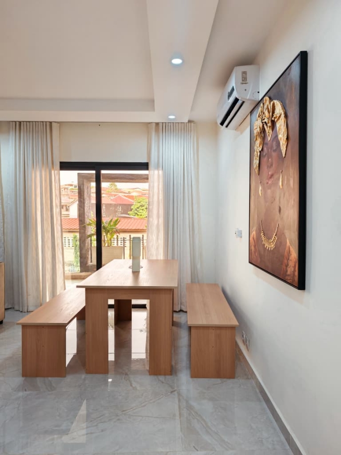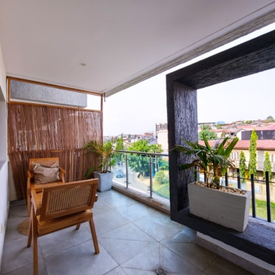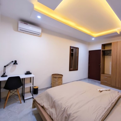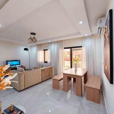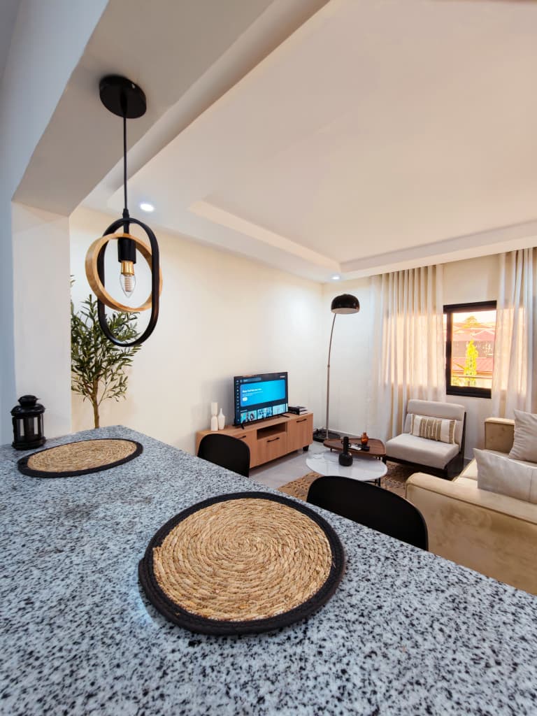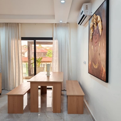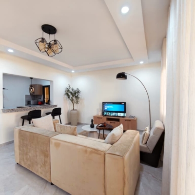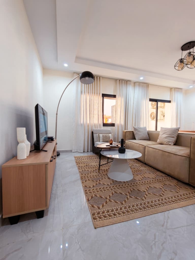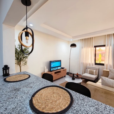 Situé à Abidjan, dans la commune de Cocody, l’Appartement Mamie Adjoua est un 2 pièces où confort et charme s’harmonisent à la perfection et tout cela dans un beau bâtiment sécurisé qui vous séduira par sa décoration épurée et par la qualité des services proposées, cet appartement meublé est au 2 ème étage dans un bâtiment neuf avec ascenseur et dispose de toutes les commodités et bénéficie d’un séjour salle à manger, une cuisine équipée, un balcon aménagé avec vue sur le secteur, une connexion internet, un abonnement canal, un parking souterrain et une salle de sport afin de vous permettre de passer un séjour de qualité en toute sécurité.