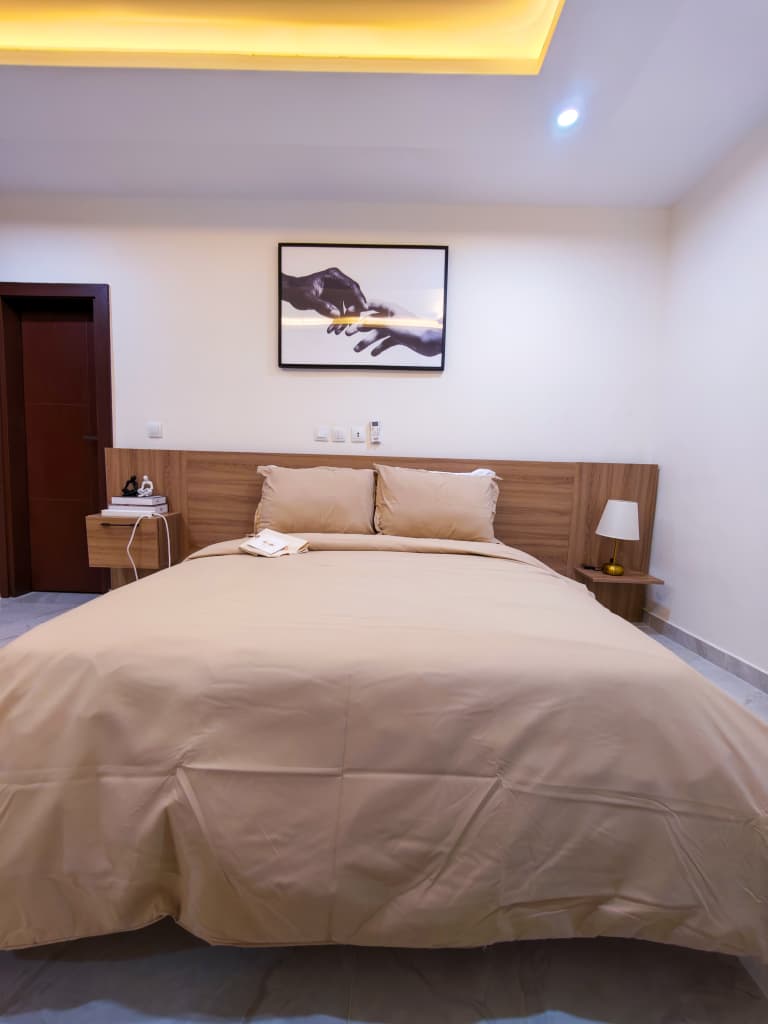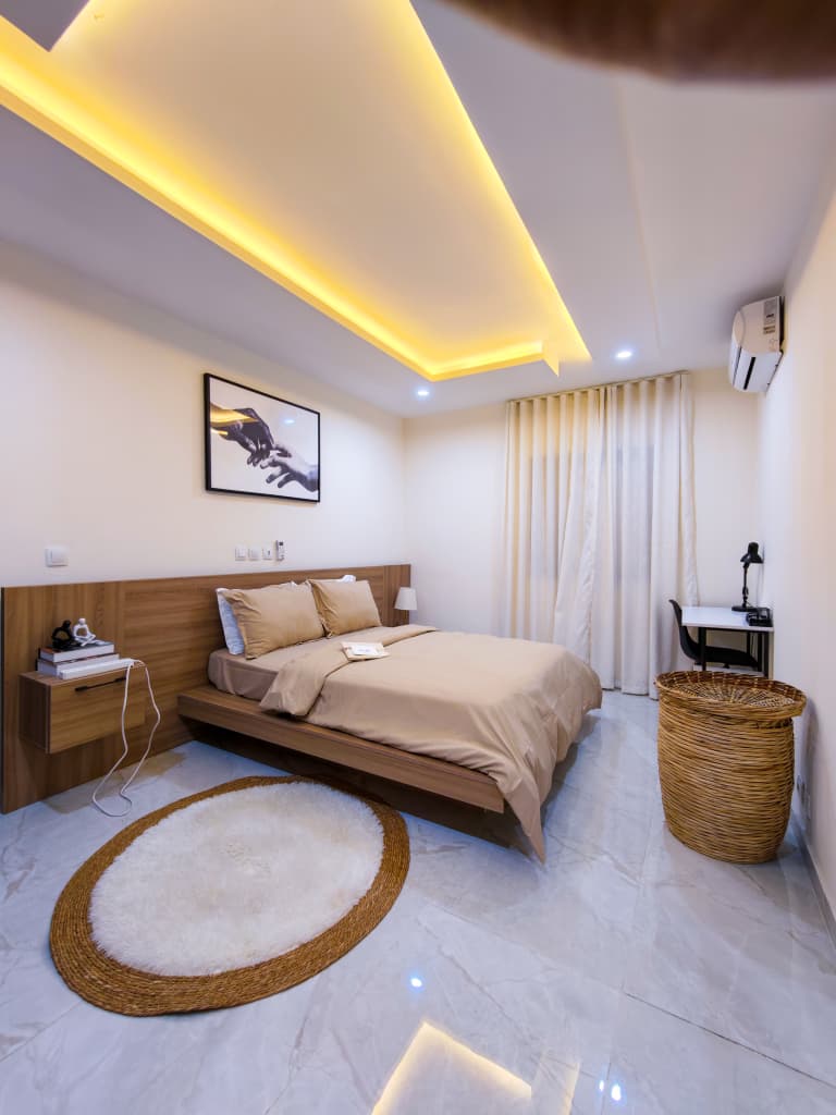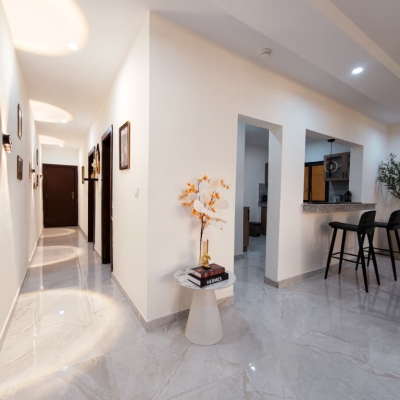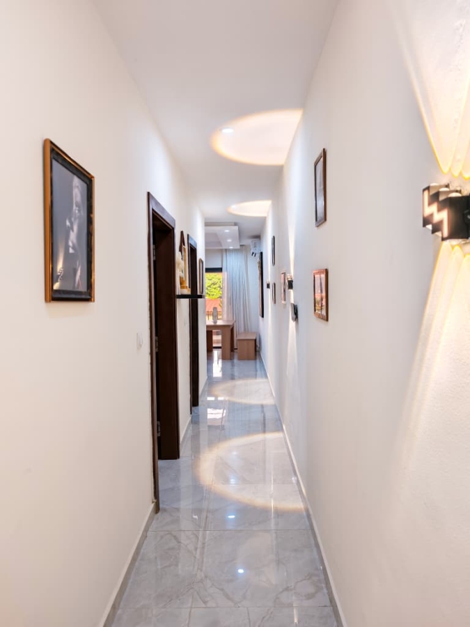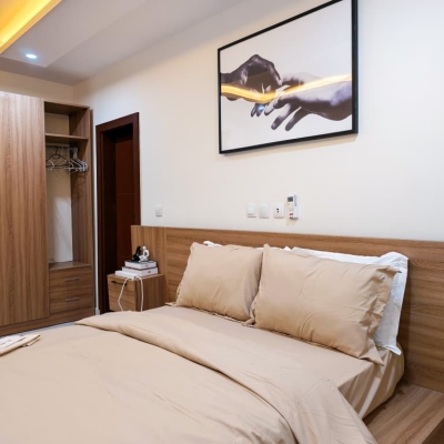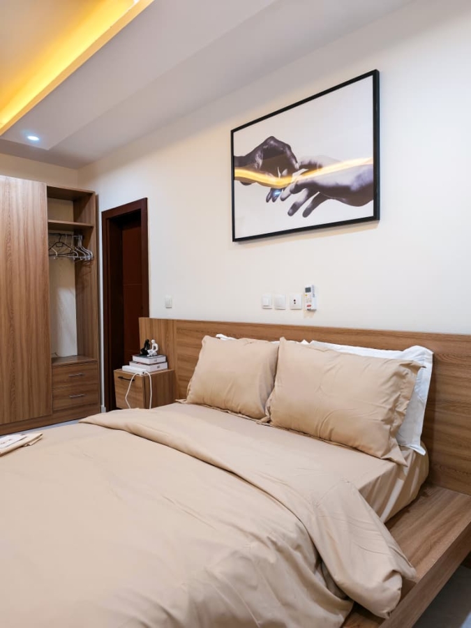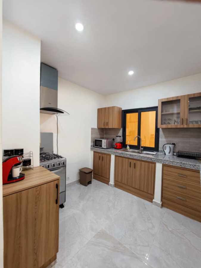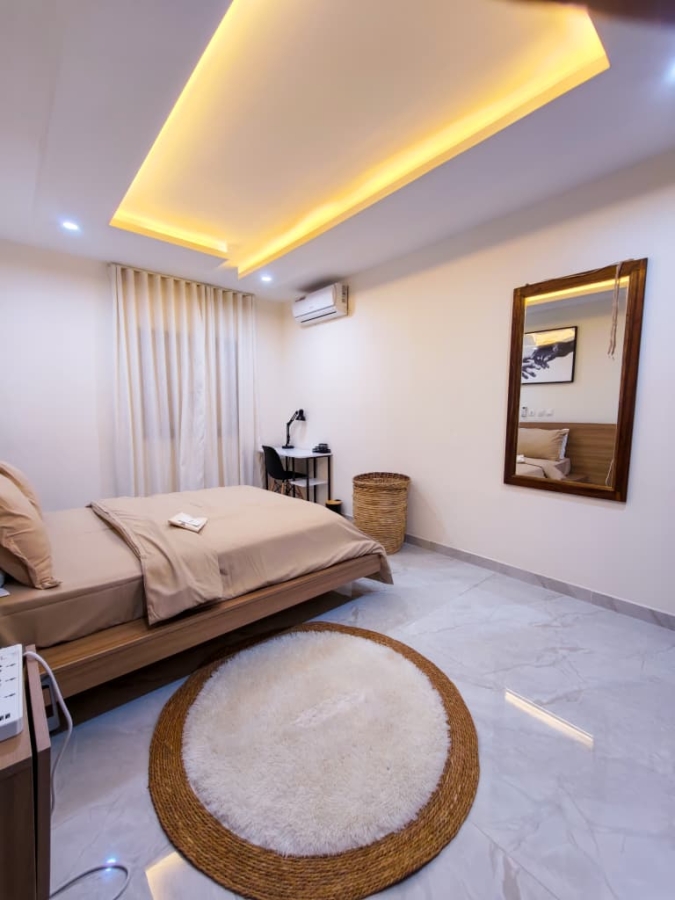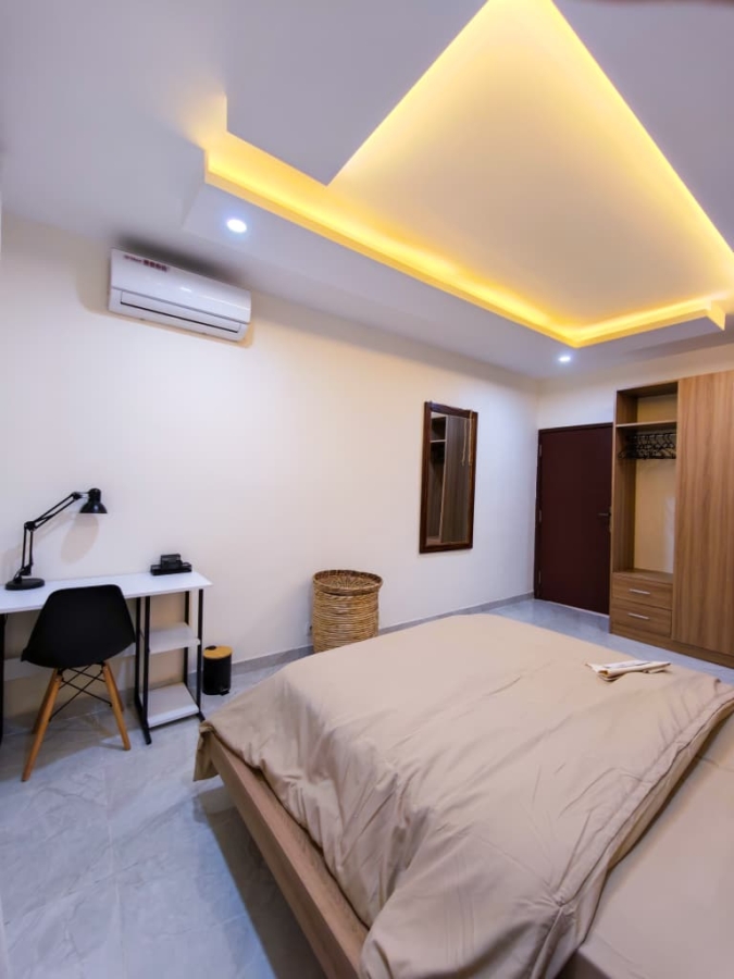 Situé à Abidjan, dans la commune de Cocody, l’Appartement Mamie Adjoua est un 2 pièces où confort et charme s’harmonisent à la perfection et tout cela dans un beau bâtiment sécurisé qui vous séduira par sa décoration épurée et par la qualité des services proposées, cet appartement meublé est au 2 ème étage dans un bâtiment neuf avec ascenseur et dispose de toutes les commodités et bénéficie d’un séjour salle à manger, une cuisine équipée, un balcon aménagé avec vue sur le secteur, une connexion internet, un abonnement canal, un parking souterrain et une salle de sport afin de vous permettre de passer un séjour de qualité en toute sécurité.